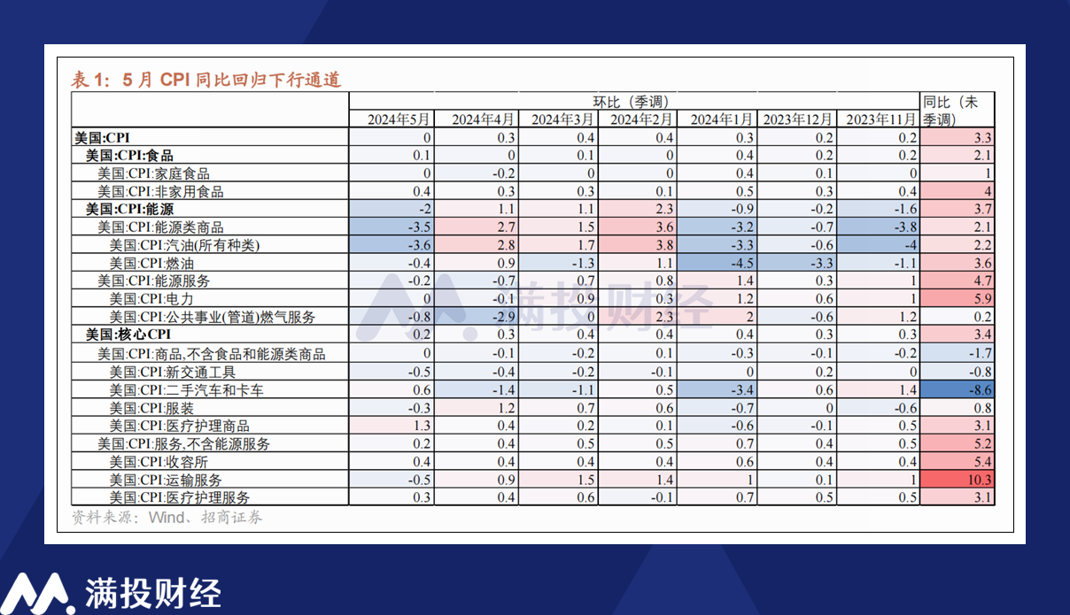 整体来看,5月美国CPI整体延续了4月的回落趋势,某种意义上反映了2024年一季度的通胀扰动更像是一股噪音,长期来看美国通胀数据依旧在温和下降的轨道上。若CPI通胀能够延续该走势,持续运行在波动下行的通道中,年内降息预期则有望迎来发挥空间。
