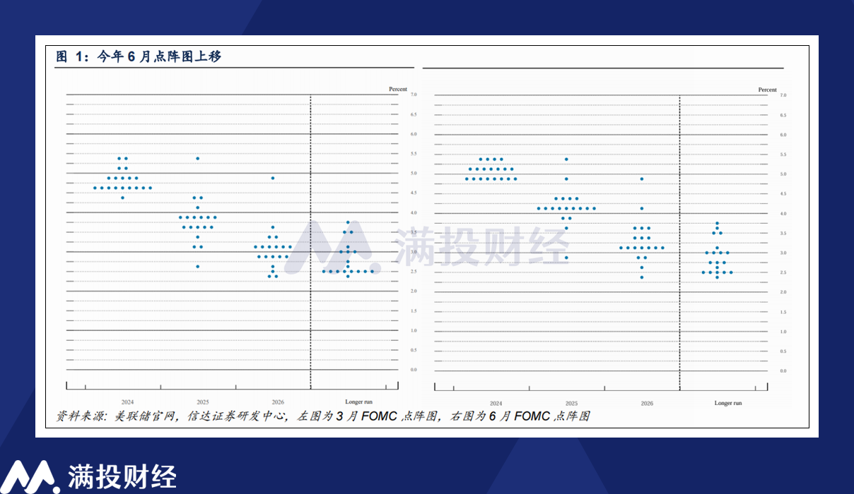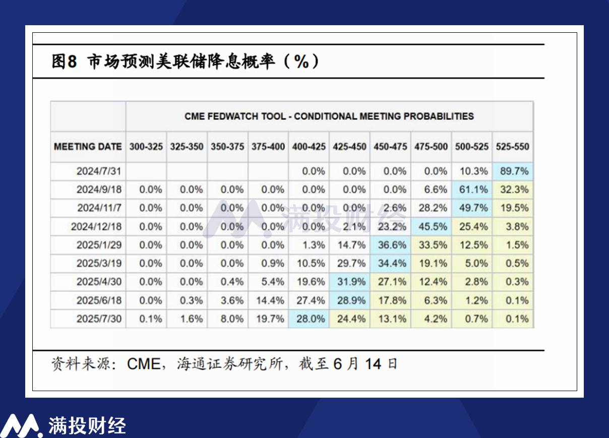 6月议息会议结束后,CME期货对美联储降息还是有了明显的改善。市场预期美联储大概率降息时点由上一周的11月提前至9月,年内预期降息次数由上周1次增加至2次,全年降息幅度为50BP。但需要注意的是,目前市场在这方面的分歧还算挺大的。外资机构对美联储的降息预期也一直存在波动,全年的降息次数是一次还是两次,首次降息时间是在9月还是在12月,都要看后续一段时间的通胀数据表现。