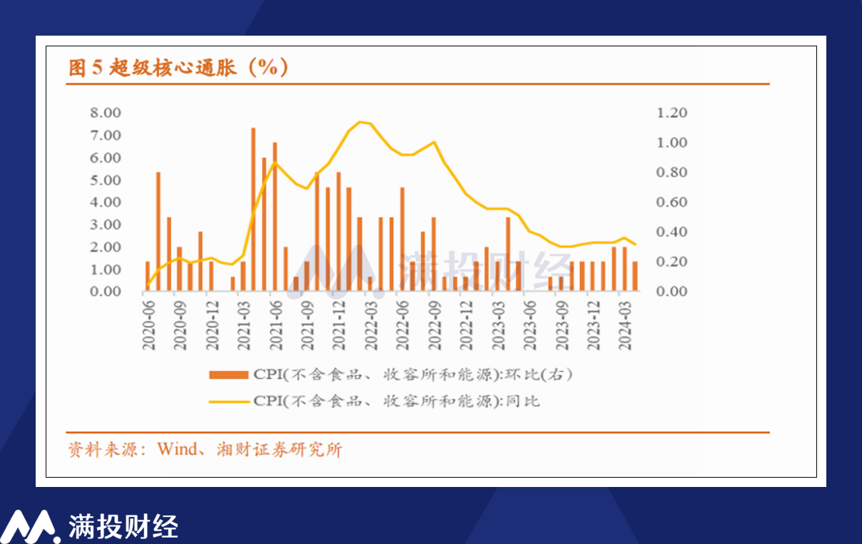 核心服务环节,分项中粘性最高的依旧是住房项通胀,环比数据连续四个月维持在0.4%的水平,同比数据也仅下降0.1%至5.4%。运输服务、医疗服务环比增速则继续维持下行趋势。值得一提的是,鲍威尔关注的超级核心通胀(核心CPI扣除住房项)同比回落至1.9%,环比下降至0%。超级核心通胀已经降至2%以下。