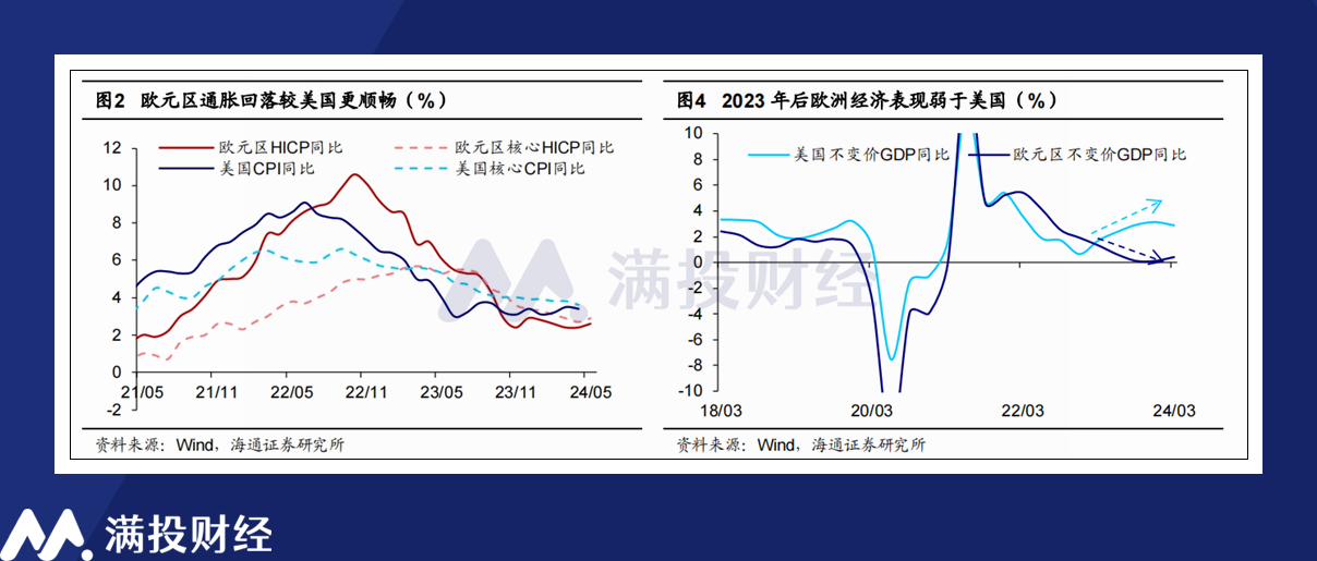 其一便是全球央行的降息节奏开始加速。2024年以来,诸如瑞典、加拿大等国家已经先于欧盟执行了降息,而英国央行此前也曾表态将于夏季开启降息。从原因上看,是因为在经济韧性和通胀粘性方面,欧洲各国显然有着和美国不同的国情。截至2024年5月,欧洲区的核心通胀读数已经回落至2.9%,相较美国而言进度更快。而截至2024年一季度,欧洲各国的GDP增速大多都以告负为结局,其在消费、投资、行业景气度方面都弱于美国,经济需要通过降息来维持/重振。