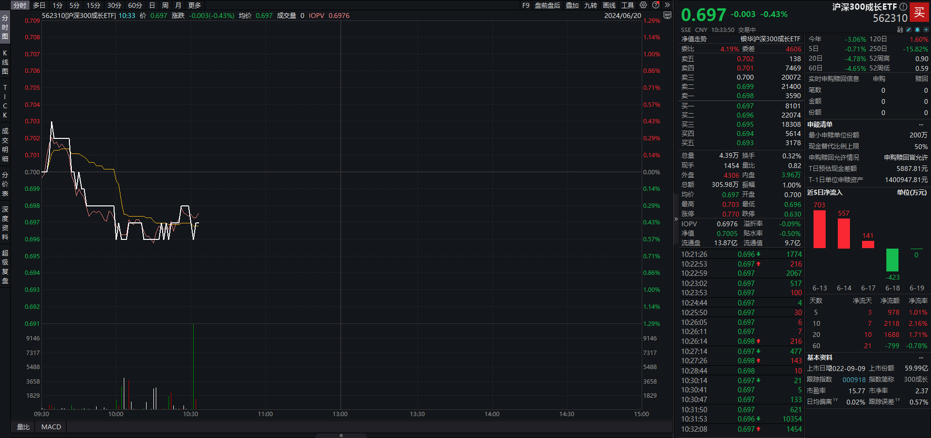 相关ETF方面,沪深300成长ETF(562310)现跌0.43%,成交额超300万元,盘中频现溢价交易,溢折率为0.04%。