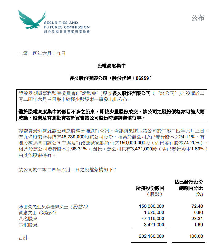 6月19日,香港证监会发布公告称,长久股份股权高度集中。具体而言,长久股份于6月3日,有9名股东合共持有4873.9万股该公司股份,相当于该公司已发行股本的24.11%。上述股权连同由该公司主席及行政总裁家族持有的1.5亿股(占已发行股本74.2%),相当于公司发行股本的98.31%。