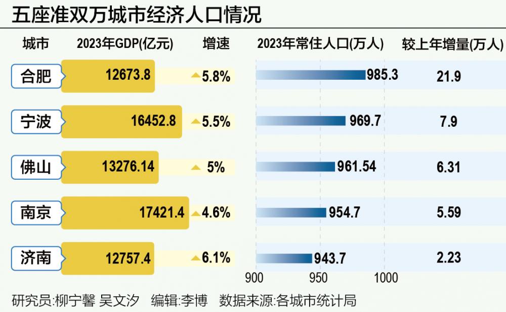 21世纪经济研究院梳理发现,截至目前,在15座双万城市之外,合肥、宁波、佛山、南京、济南5座城市GDP超过万亿且常住人口超过940万人,可视为准双万城市。其中,合肥2023年常住人口985.3万人且较上年增加21.9万人,按照这个人口增长速度,成为今年有望进阶双万城市的头号候选城市。