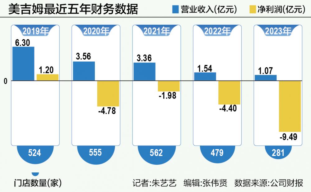 在2019年实现营收6.30亿元,归母净利润1.20亿元之后,美吉姆业绩遭遇断崖式下滑,2020年—2023年,公司营收分别为3.56亿元、3.36亿元、1.54亿元、1.07亿元;归母净利润分别为-4.78亿元、-1.98亿元、-4.40亿元、-9.49亿元,多年亏损。