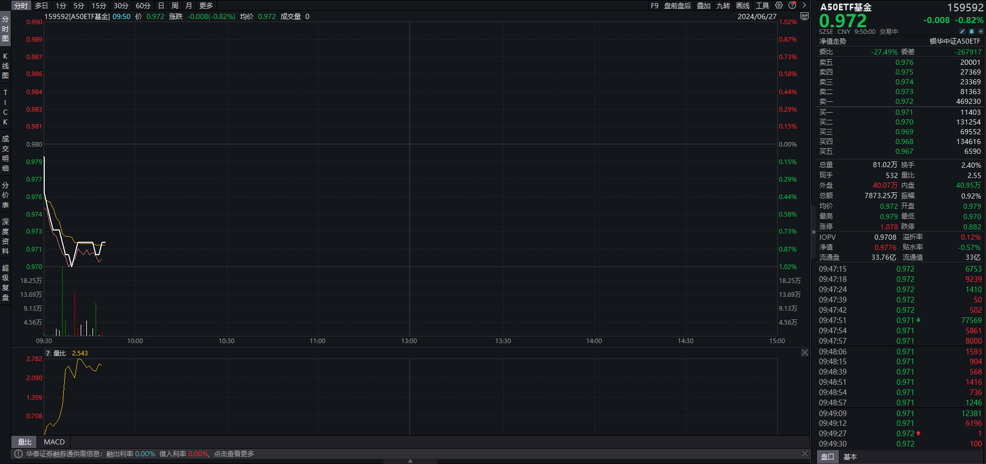 相关ETF方面,A50ETF基金(159592)现跌0.82%,成交额近0.8亿元,盘中交投活跃,换手率超2.4%,溢折率0.12%,早盘频现溢价交易。