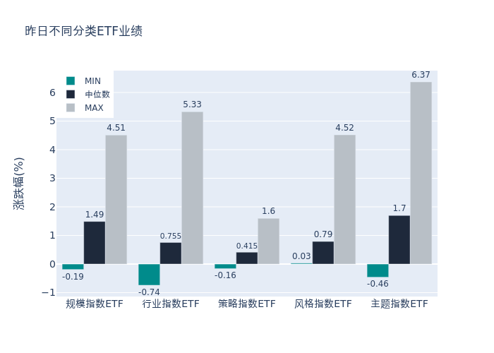 昨日股票型ETF收益率中位数为1.36%。其中按照不同分类,规模指数中华夏创业板中盘200ETF收益率最高,为4.51%;行业指数中南方中证全指计算机ETF收益率最高,为5.33%;策略指数中前海开源中证500等权ETF收益率最高,为1.6%;风格指数中国寿安保创精选88ETF收益率最高,为4.52%;主题指数中华夏中证动漫游戏ETF收益率最高,为6.37%。