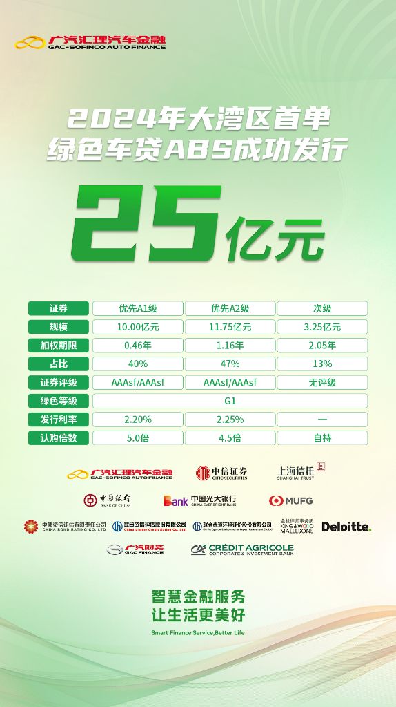 广汽汇理作为汽车金融行业的引领者之一,正积极响应国家对于金融服务实体经济的战略号召,以实际行动贯彻金融五篇大文章。为了完善在绿色金融领域的布局,为构建新发展格局贡献力量,2024年3月广汽汇理成功发行25亿元绿色ABS,践行绿色发展理念,积极响应国家绿色金融政策。