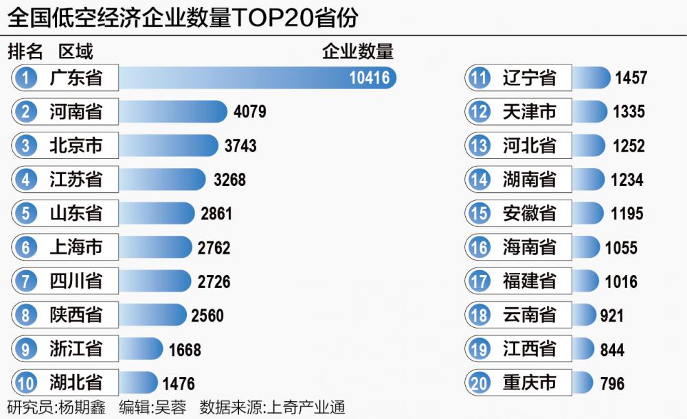 逐一来看,在低空经济相关企业数量上,广东、河南及北京展现出较强的竞争力。根据上奇产业通数据,截至2024年5月30日,广东、河南、北京低空经济相关企业数量位列全国前三,分别达10416家、4079家、3743家,广东占全国比重高达20.23%。