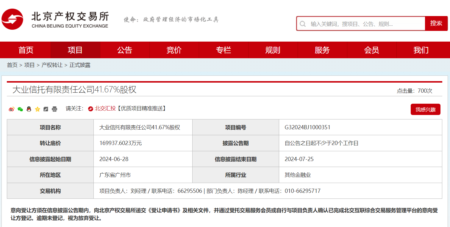 6月28日,北京产权交易所挂出大业信托41.67%股权转让的项目,转让底价169937.6023万元,转让方为大业信托第一大股东中国东方资产管理股份有限公司,信息披露时间自6月28日至7月25日。