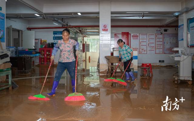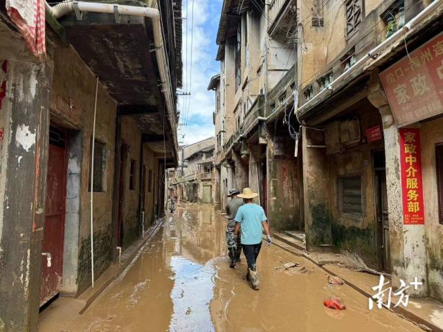 在梅县区松源镇横坊村,“一楼淤泥近20厘米厚,不及时清理就会结成硬块了。”穿着救援服装的张毅从民房中探出头来,汗水和脏水湿了他的衣服。透过窗户,记者看到一个清淤攻坚小组正在加紧作业,他们先清淤、后冲水,再排成队把黄泥水推出门外。