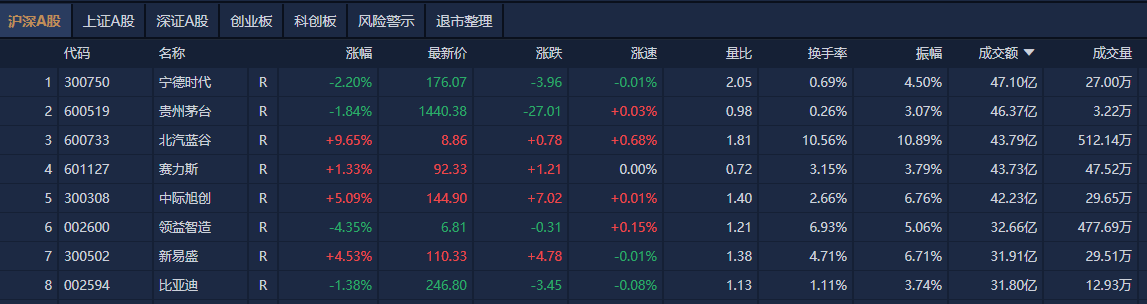 沪深两市今日成交额6580亿,较上个交易日缩量452亿。个股上,宁德时代成交额47.1亿元居首,贵州茅台、北汽蓝谷、赛力斯、中际旭创的成交额均在40亿元以上。