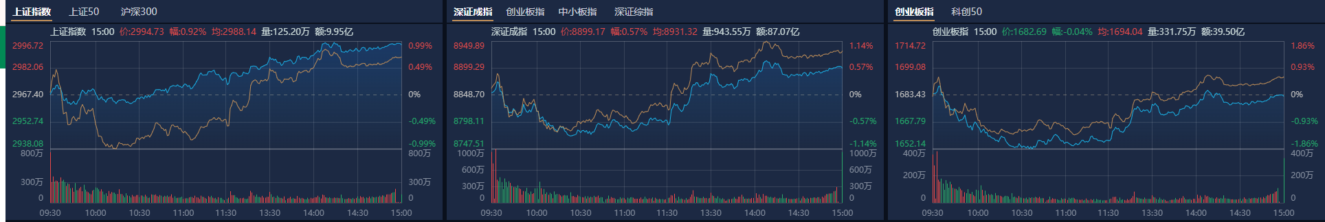 市场全天震荡反弹,沪指领涨。南财金融终端显示,截至收盘,沪指涨0.92%,深成指涨0.57%,创业板指跌0.04%。总体上个股涨多跌少,全市场超3500只个股上涨。