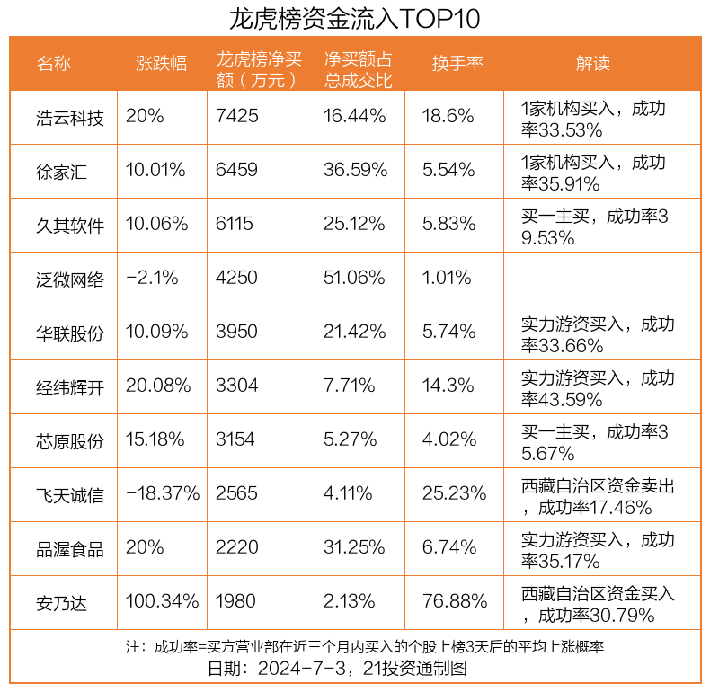 7月3日,上证指数下跌0.49%,深证成指下跌0.59%,创业板指下跌0.3%。盘后龙虎榜数据显示,共有45只个股因当日异动登上龙虎榜,资金净流入最多的是浩云科技(300448.SZ),达0.74亿元。