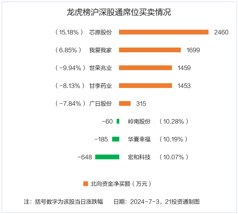 7月3日,北向资金参与龙虎榜中的个股共有8只,合计净买入6492.56万元。其中沪股通净买入3股,净卖出2股,合计净买入3394.63万元;深股通净买入2 股,净卖出1股,合计净买入3097.93万元。
