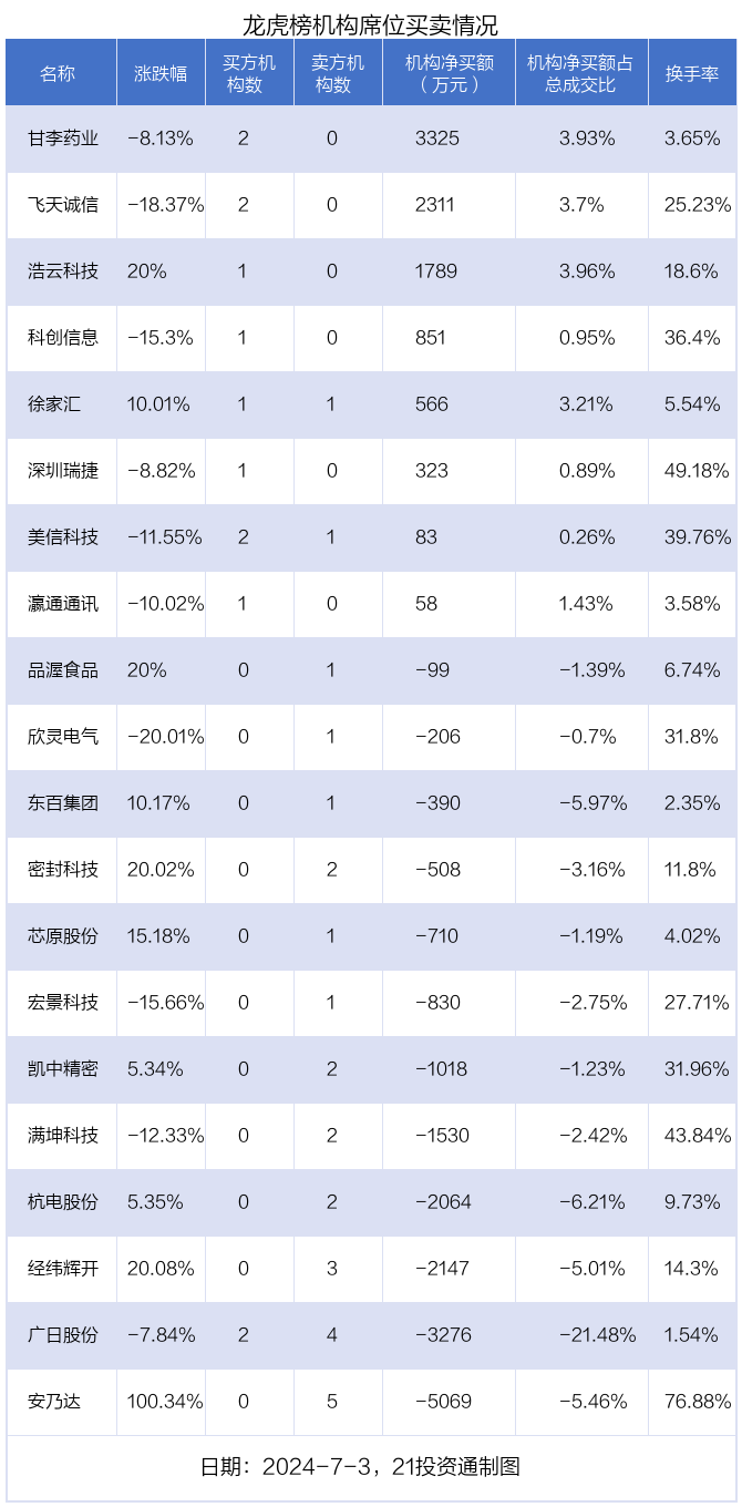 7月3日,20只个股龙虎榜出现了机构的身影,机构合计净卖出8539.67万元。具体来看,机构净买入8股,净卖出12股。