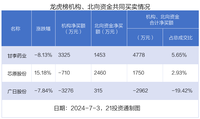 值得注意的是,机构和北向资金共同净买入了甘李药业;在芯原股份、广日股份上出现分歧,机构净卖出芯原股份709.73万元,北向资金净买入2459.99万元;机构净卖出广日股份3276.39万元,北向资金净买入314.87万元。