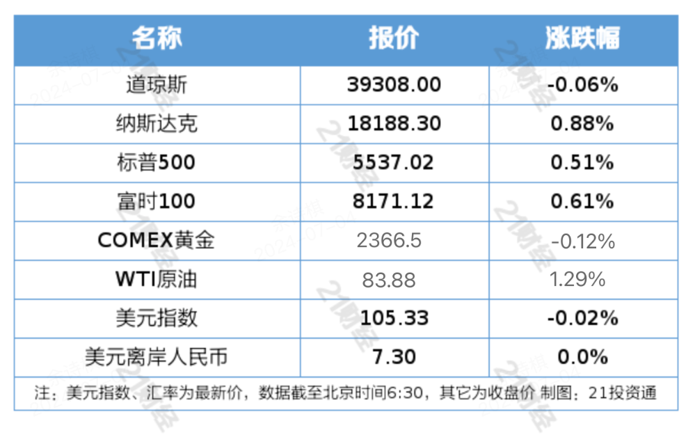 纽约股市三大股指3日涨跌不一。截至当天收盘,道琼斯工业平均指数比前一交易日下跌23.85点,收于39308.00点,跌幅为0.06%;标准普尔500种股票指数上涨28.01点,收于5537.02点,涨幅为0.51%;纳斯达克综合指数上涨159.54点,收于18188.30点,涨幅为0.88%。