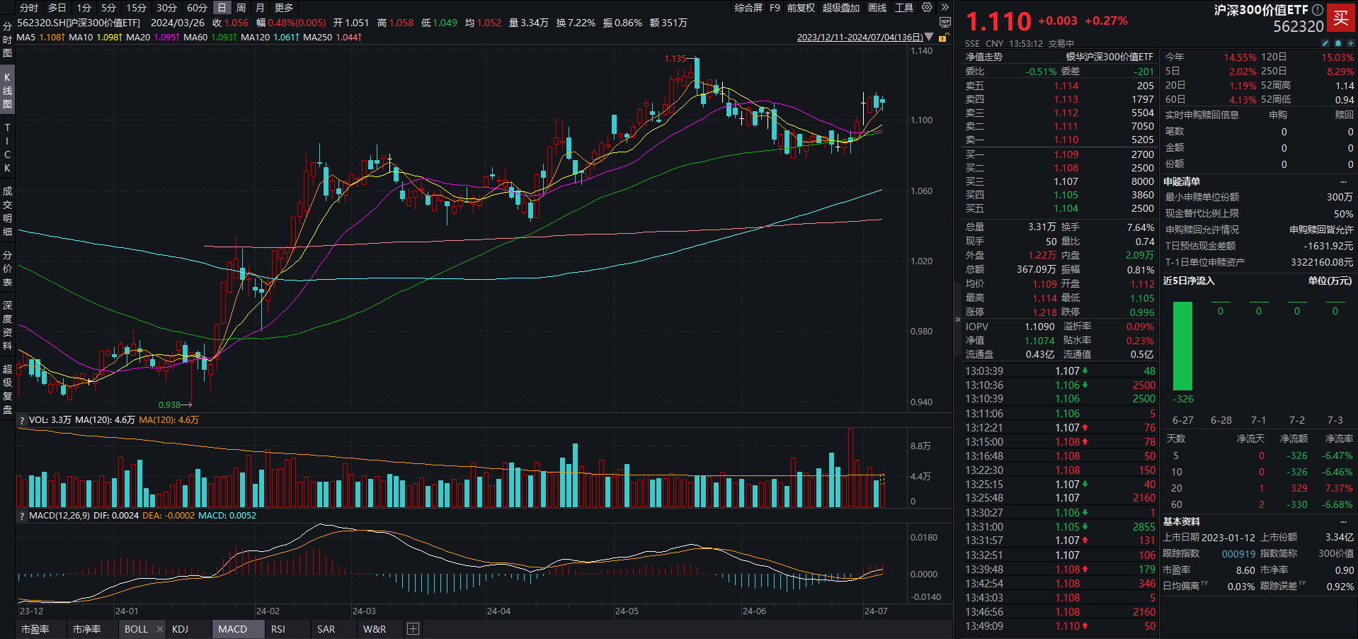 相关ETF方面,截至发稿,沪深300价值ETF(562320)涨0.27%,换手率超7%,盘中交投活跃,溢折率为0.09%。