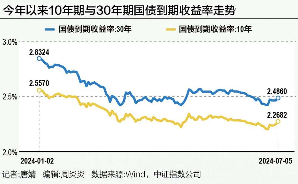 值得一提的是,财政部6月中旬发行的50年期超长期特别国债中标收益率为2.53%,已经低于此前两次发行的30年期特别国债收益率。5月17日与6月7日,财政部两次发行30年期特别国债,中标收益率分别是2.57%与2.5319%。一位私募基金交易员曾向本报记者表示,这种国债收益率倒挂状况(50年期特别国债收益率低于30年期)不会持续很久,因为这将“扰乱”整个国债收益率曲线。