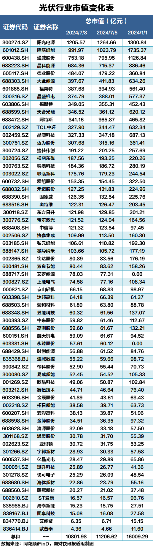 成分股中,时创能源跌7.54%,阿特斯、华民股份、连城数控等跌超6%。巨头中,通威股份跌5.37%、TCL中环跌4.81%、阳光电源跌4.67%,隆基绿能跌3.11%,总市值跌破千亿元。南财快讯记者注意到,行业内仅有阳光电源的总市值上千亿元。