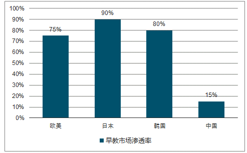 前瞻产业研究院的《2019 年中国早教产业全景图谱》等几份行业报告中显示,目前欧美国家、日本、韩国的早教普及率分别75%、90%、80%,而中国内地不到20%,其中一、二、三线城市的早教普及率分别为44.01%、29.29%和14.26%,而四五线及以下城市只有9.66%。