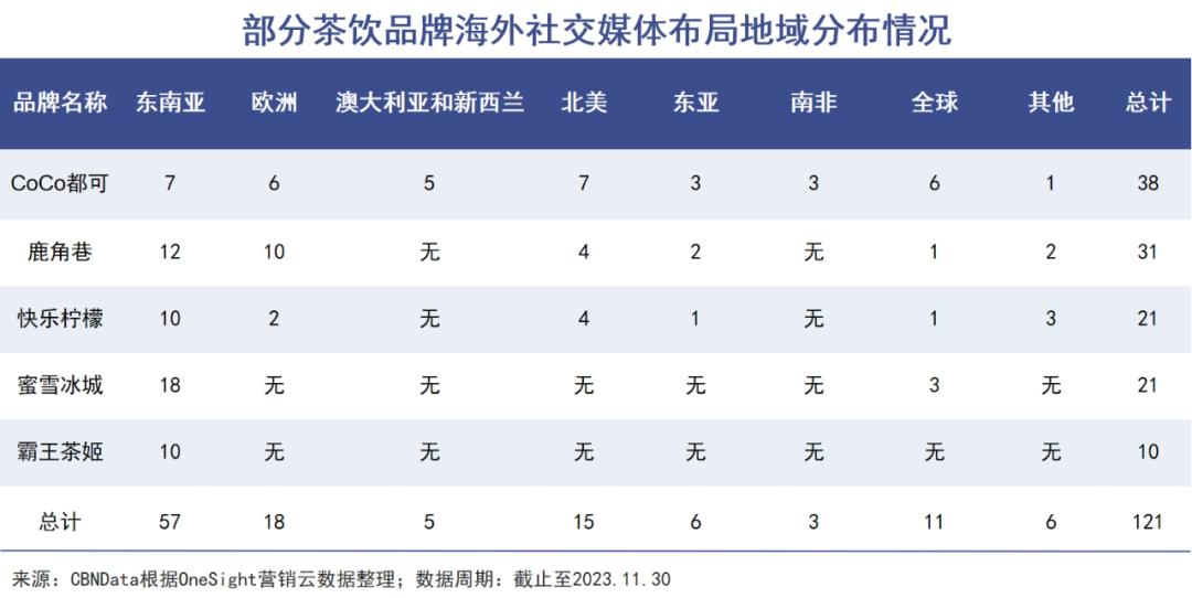 OneSight营销云数据显示,东南亚是目前茶饮品牌出海的首选。根据茶饮品牌社交媒体的布局看,CoCo、鹿角巷、蜜雪冰城、霸王茶姬等品牌都将东南亚作为出海重镇,其次是欧洲和北美,除此之外,中东也成为部分茶饮品牌出海掘金的新目的地。