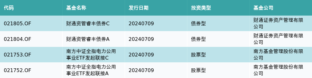 7月9日有4只新基金发行,分别为:财通资管睿丰债券C、财通资管睿丰债券A、南方中证全指电力公用事业ETF发起联接C、南方中证全指电力公用事业ETF发起联接A,详情见下表: