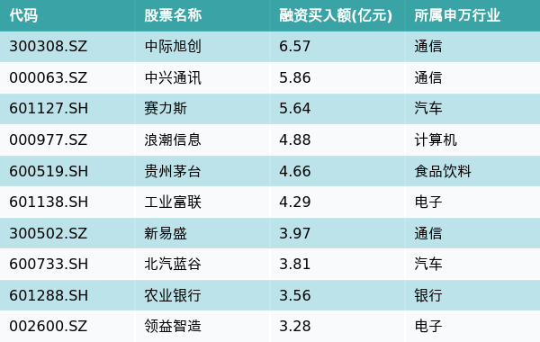 7月9日,两市共有3352只个股有融资资金买入,其中中际旭创、中兴通讯、赛力斯排名前三,买入金额分别6.57亿元、5.86亿元、5.64亿元。融资买入额前10个股详情见下表: