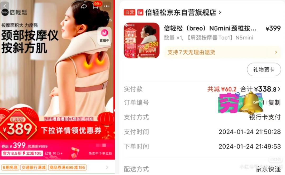 但这个解释显然难以说服消费者,而且类似的事情并不少见:TCL 98T8H在618期间直播间的到手价为11399元,而在京东的同期活动期中,这款商品降到了10999元;倍轻松N5mini肩颈按摩器,直播间的价格为389元,京东价格339元。