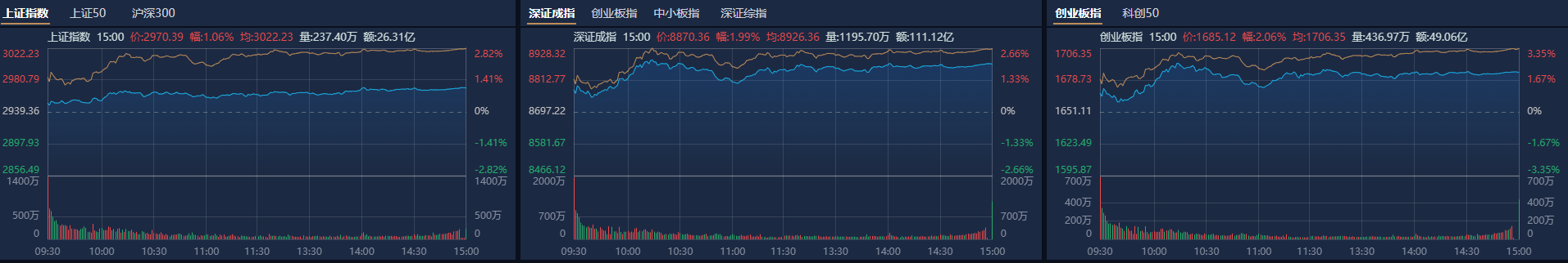市场全天高开高走,创业板指领涨,多个超跌板块集体反弹。南财金融终端显示,截至收盘,沪指涨1.06%,深成指涨1.99%,创业板指涨2.06%。