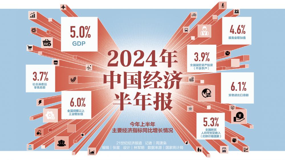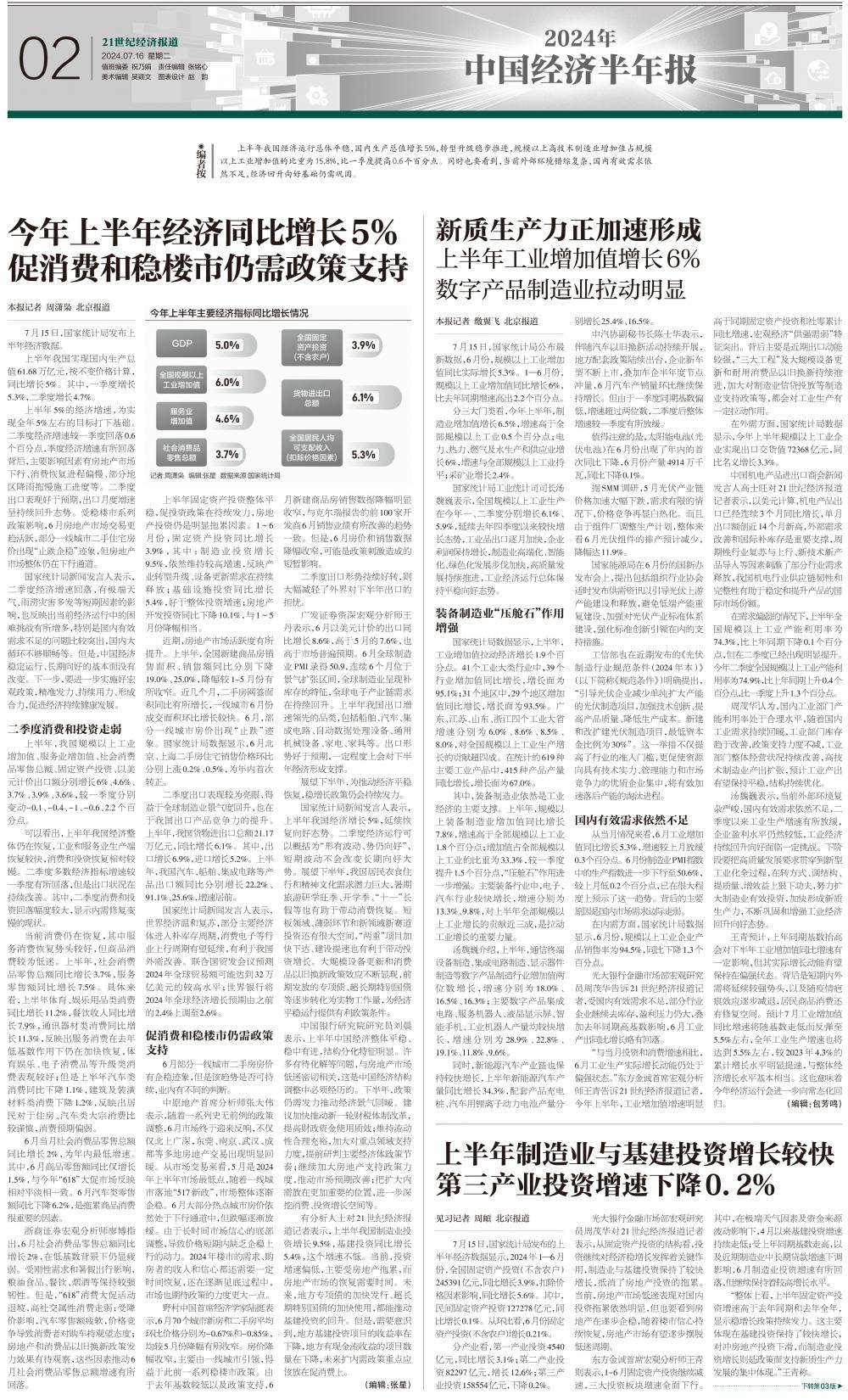 上半年我国经济运行总体平稳,国内生产总值增长5%,转型升级稳步推进,规模以上高技术制造业增加值占规模以上工业增加值的比重为15.8%,比一季度提高0.6个百分点。同时也要看到,当前外部环境错综复杂,国内有效需求依然不足,经济回升向好基础仍需巩固。