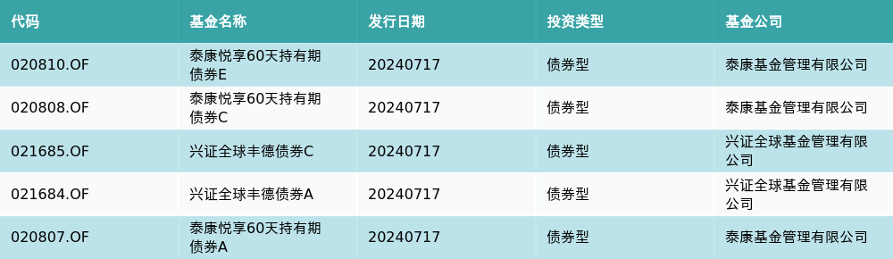 7月17日有5只新基金发行,分别为:泰康悦享60天持有期债券E、泰康悦享60天持有期债券C、兴证全球丰德债券C、兴证全球丰德债券A、泰康悦享60天持有期债券A,详情见下表: