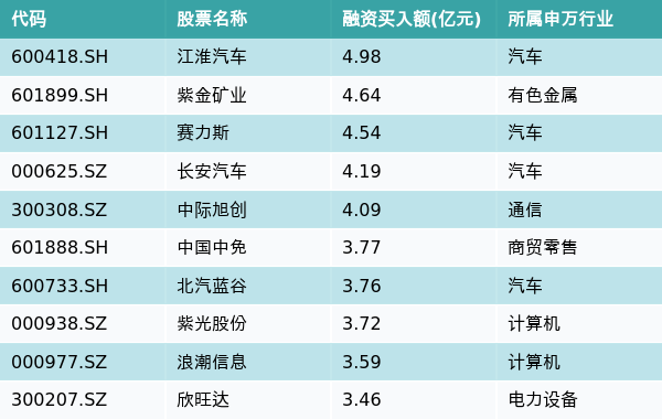 7月17日,两市共有3350只个股有融资资金买入,其中江淮汽车、紫金矿业、赛力斯排名前三,买入金额分别4.98亿元、4.64亿元、4.54亿元。融资买入额前10个股详情见下表: