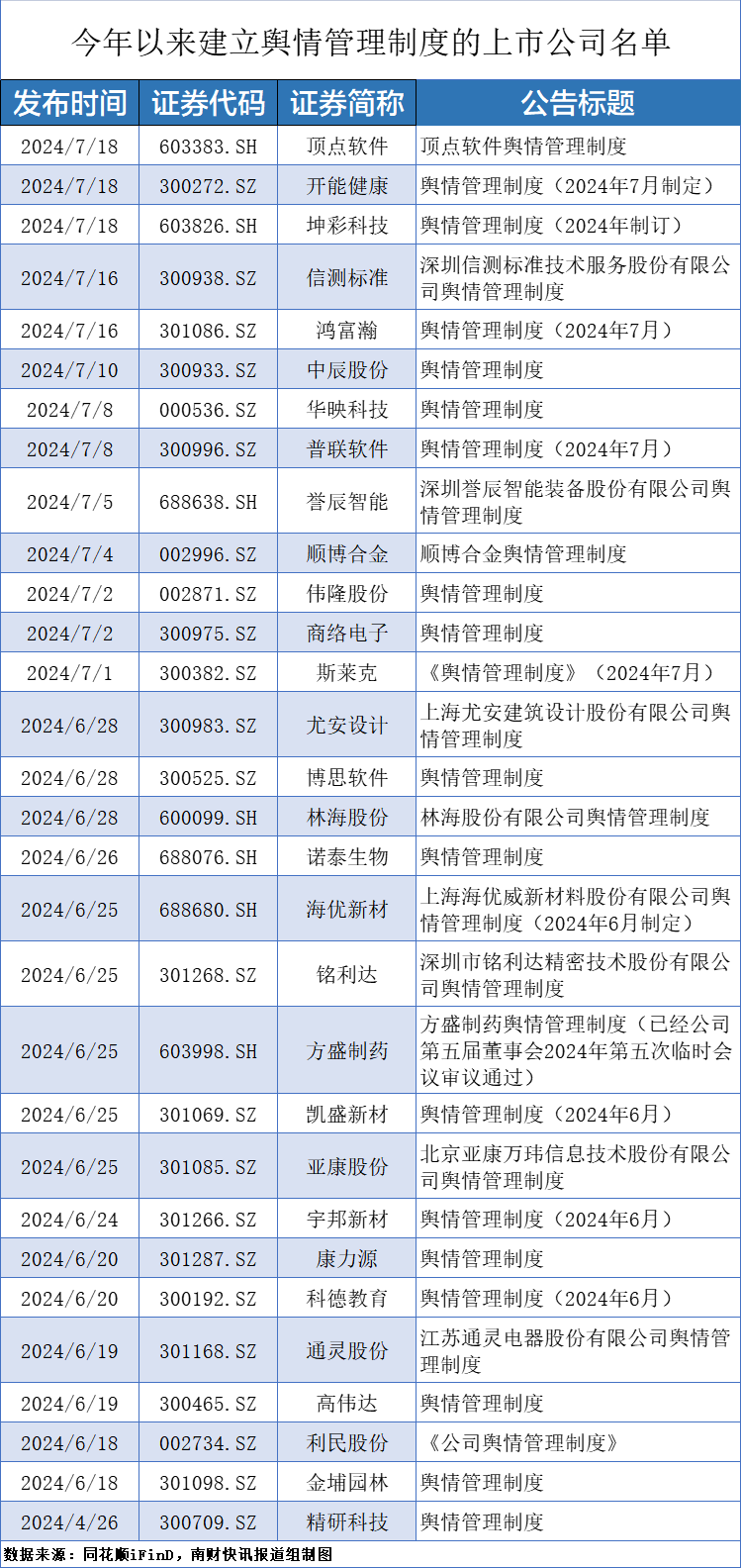 7月18日,又有三家上市公司公告建立舆情管理制度。