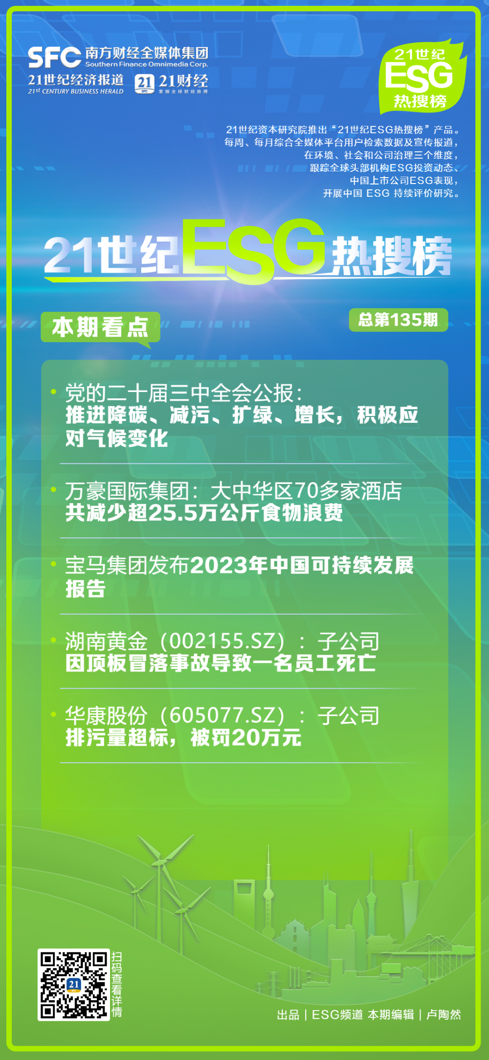 21世纪ESG热搜榜(第135期)丨湖南黄金子公司因顶板冒落事故导致一名员工死亡;万豪国际集团大中华区70多家酒店共减少超25.5万公斤食物浪费