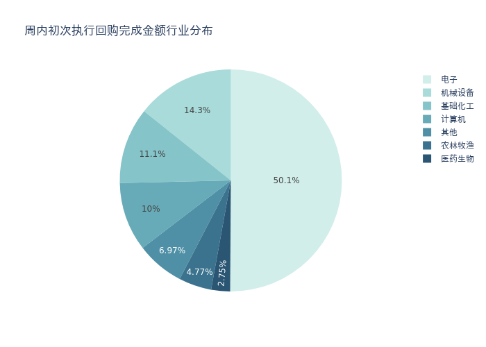 按照初次执行金额所在不同行业分布,金额最高的3个行业分别为:电子、机械设备、基础化工,详情见下图: