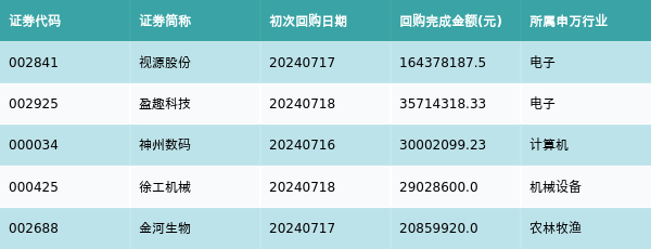 上周共有47条开始执行回购公告,其中执行金额最多的5条公告为: