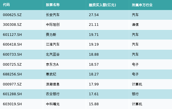 上周两市共有3353只个股有融资资金买入,共有30只个股买入金额超10亿元,其中长安汽车、中际旭创、赛力斯排名前三,买入金额分别27.54亿元、21.11亿元、19.71亿元。融资买入额前10个股详情见下表: