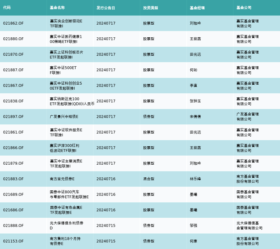 上周有15只新基金发行,分别为:嘉实央企创新驱动ETF联接I、嘉实中证医药健康100策略ETF联接I、嘉实上证科创板芯片ETF发起联接I、嘉实中证500ETF联接I、嘉实中证科创创业50ETF发起联接I、嘉实纳斯达克100ETF发起联接(QDII)I人民币、广发景兴中短债E、嘉实中证软件服务ETF联接I、嘉实沪深300红利低波动ETF联接I、嘉实中证主要消费ETF发起联接I、南方宝元债券E、国泰中证800汽车与零部件ETF发起联接E、国泰中证有色金属ETF发起联接E、光大保德信永利债券D、南方集利18个月持有债券E,详情见下表: