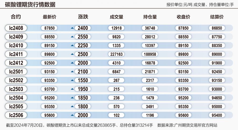 从最新的交易数据来看,截至2024年7月19日,碳酸锂期货和期权累计成交量7492.54万手,累计成交额73983.84亿元;日均成交量30.99万手,日均持仓量34.58万手,市场规模稳步增长。
