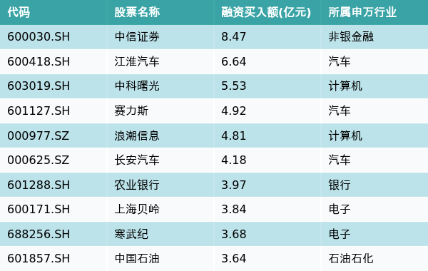 7月22日,两市共有3351只个股有融资资金买入,其中中信证券、江淮汽车、中科曙光排名前三,买入金额分别8.47亿元、6.64亿元、5.53亿元。融资买入额前10个股详情见下表: