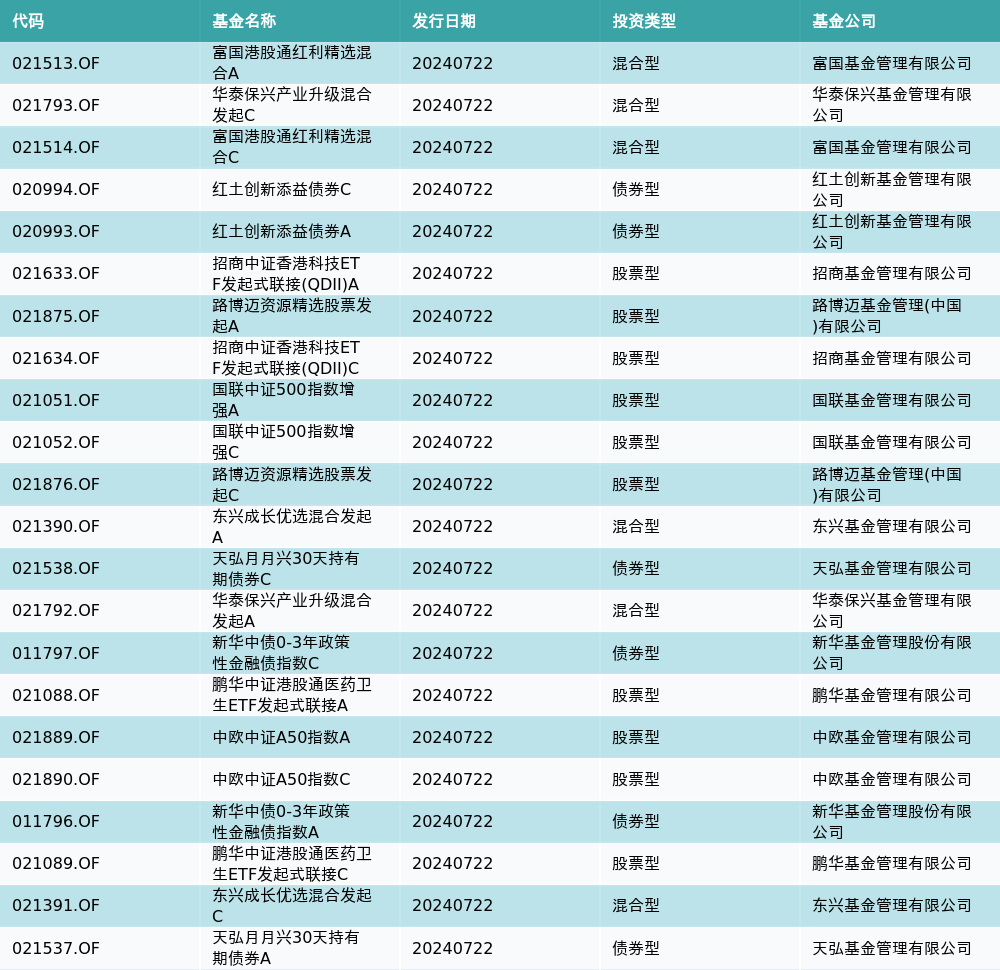 7月22日有22只新基金发行,分别为:富国港股通红利精选混合A、华泰保兴产业升级混合发起C、富国港股通红利精选混合C、红土创新添益债券C、红土创新添益债券A、招商中证香港科技ETF发起式联接(QDII)A、路博迈资源精选股票发起A、招商中证香港科技ETF发起式联接(QDII)C、国联中证500指数增强A、国联中证500指数增强C、路博迈资源精选股票发起C、东兴成长优选混合发起A、天弘月月兴30天持有期债券C、华泰保兴产业升级混合发起A、新华中债0-3年政策性金融债指数C、鹏华中证港股通医药卫生ETF发起式联接A、中欧中证A50指数A、中欧中证A50指数C、新华中债0-3年政策性金融债指数A、鹏华中证港股通医药卫生ETF发起式联接C、东兴成长优选混合发起C、天弘月月兴30天持有期债券A,详情见下表: