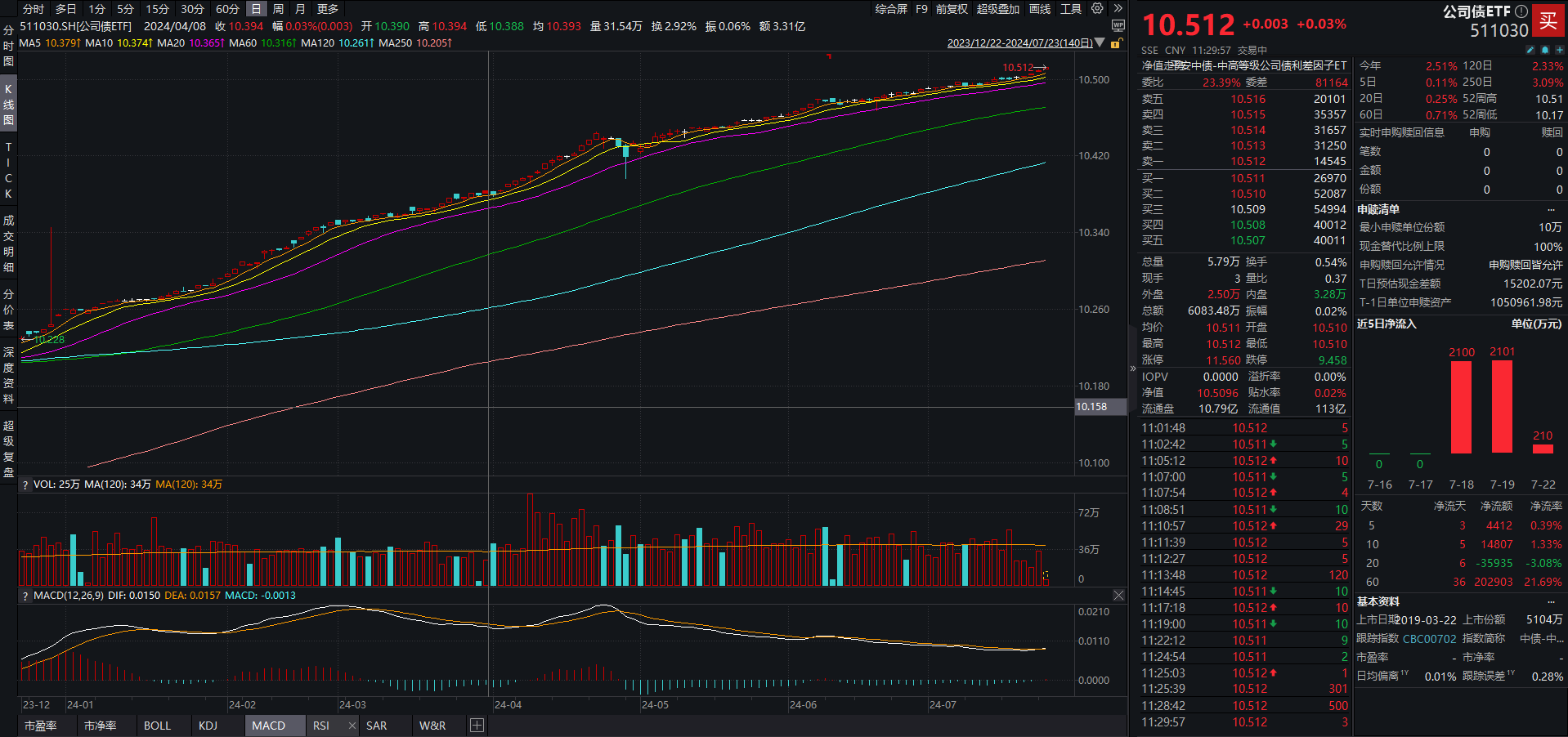 公司债ETF(511030)是国内首只SmartBeta债券ETF,同时也是首只中高等级信用债ETF。它主要投资于上交所上市的双AAA主体/债项和隐含AA以上的公司债,定位为信用债宽基和国央企公司债。