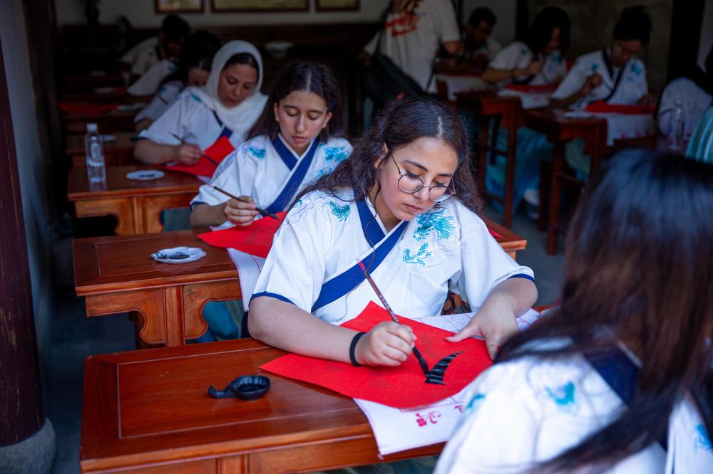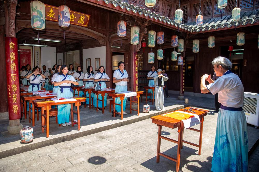 “有礼仪之大故称夏,有服章之美谓之华”,他们身着汉服,亲身感受中华服饰文化的优雅飘逸之美,跟着国学老师学习作揖、行礼,感受中华传统礼仪的端方沉稳之美,学写毛笔汉字,感受汉字和书法墨韵之美,在老师指导下写下“双龙”“仙的金华山”等字样,他们表示自己第一次体验中国书法,作品一定要珍藏起来,带回国作纪念。