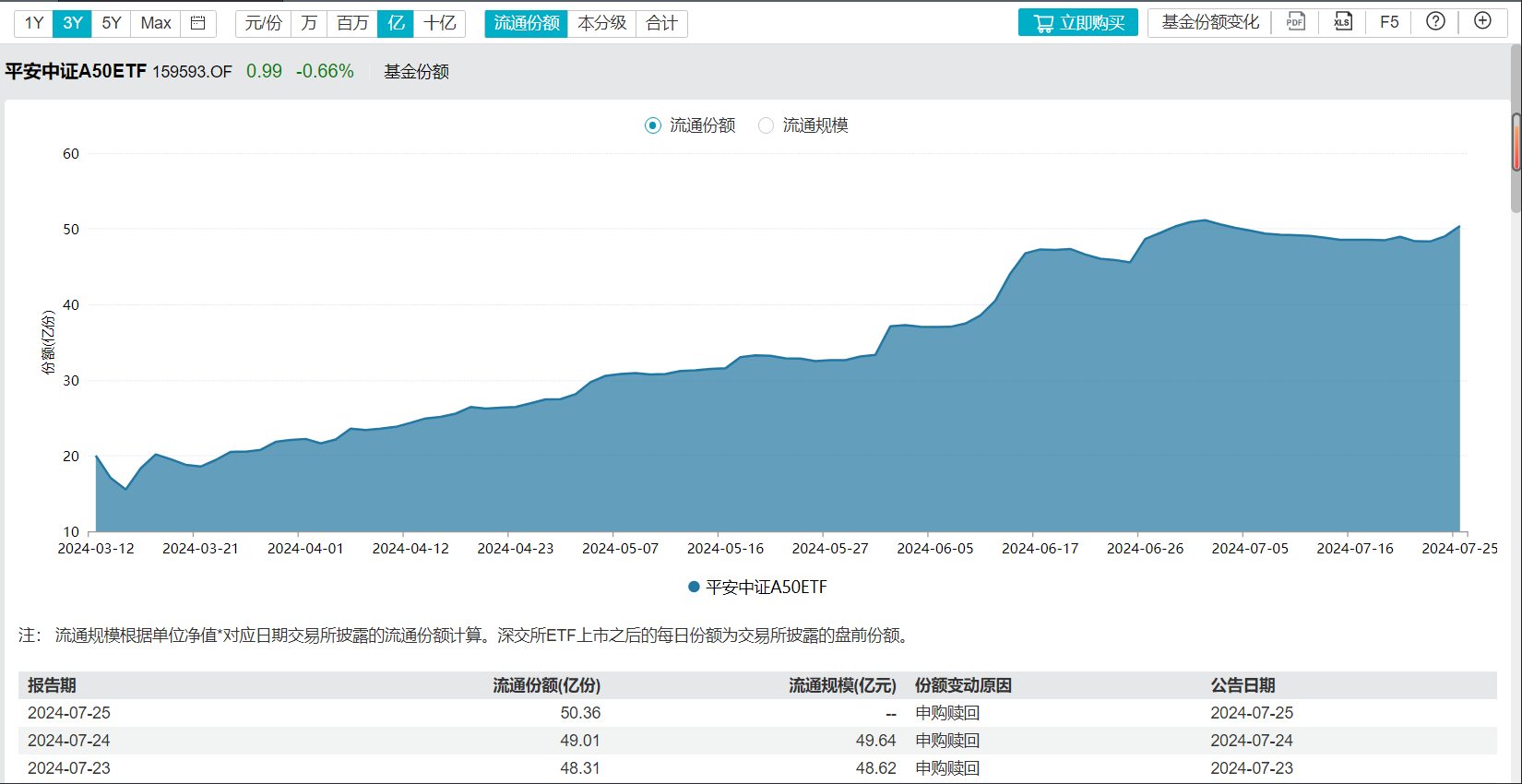 随着资金流入,中证A50指数ETF(159593)基金份额重回50亿份。Wind数据显示,截至7月24日收盘,该ETF场内流通份额达50.36亿份,最新规模为49.64亿元。
