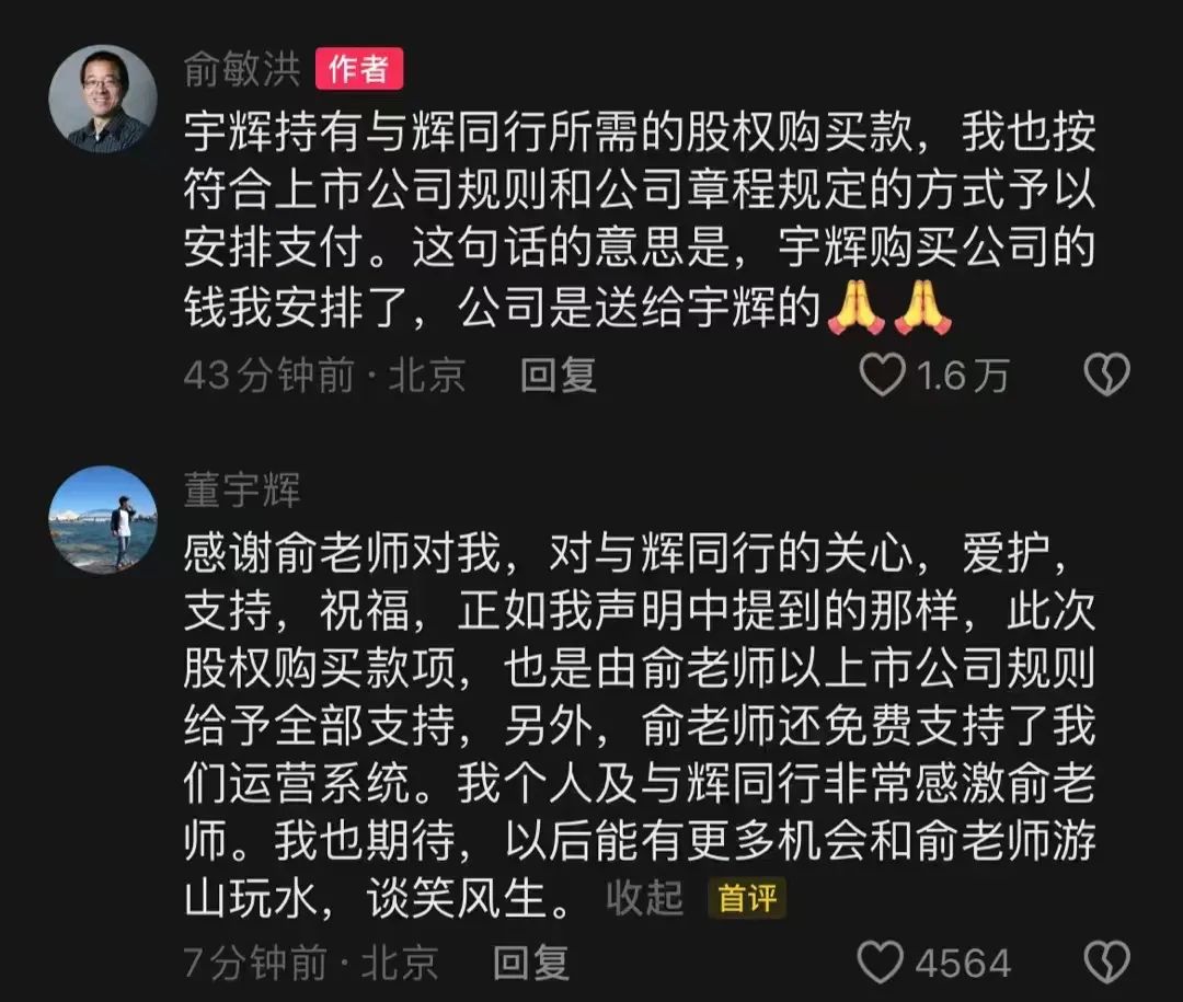 随后,俞敏洪在公开信评论中进一步解释了公告信息,他称,“'宇辉持有与辉同行所需的股权购买款,我也按符合上市公司规则和公司章程规定的方式予以安排支付',这句话的意思是,宇辉购买公司的钱我安排了,公司是送给宇辉的。”