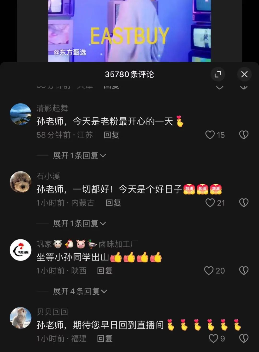 值得玩味的是,东方甄选宣布董宇辉离职的消息后,不少网友到东方小孙抖音账号留言:孙老师,今天是个好日子,期待您早日回到直播间。