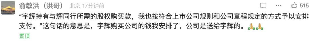 俞敏洪在《致东方甄选股东朋友的一封公开信》中表示,从今天开始,东方甄选的全资子公司与辉同行,将正式从东方甄选独立出去,由董宇辉个人持有其100%股权。同时,“宇辉买公司的钱我(指由东方甄选)安排了,公司是送给宇辉的。”