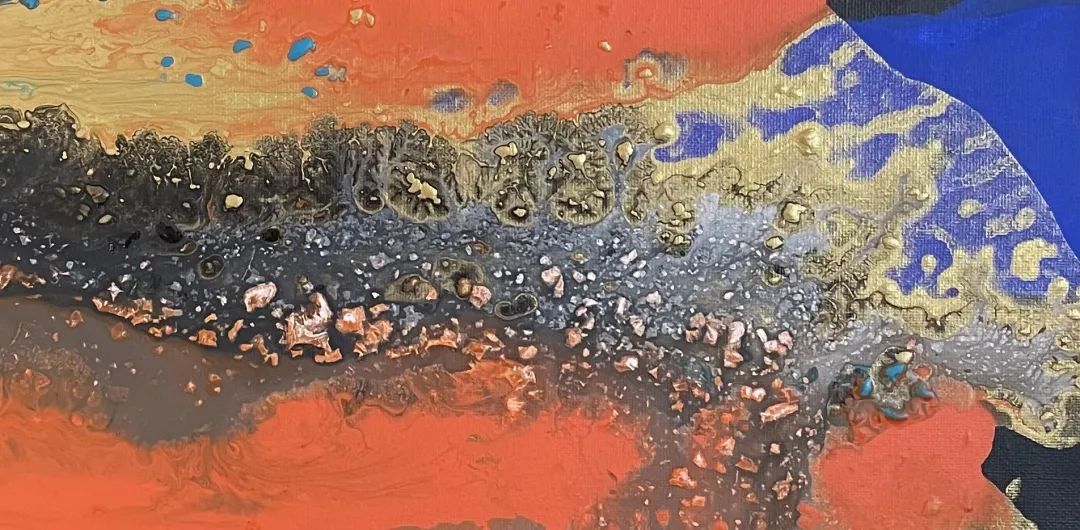画面中央,“金冠呈霞”成为视觉焦点,金色与霞色交织,既象征着尊贵与辉煌,又蕴含着晨曦初露时的温柔与希望。金色光点如宝石般镶嵌,每一笔都经过精心布局,肌理斑点,如同夜空中最亮的星辰,既独立成景,又相互呼应,共同编织出一幅梦幻般的图景。