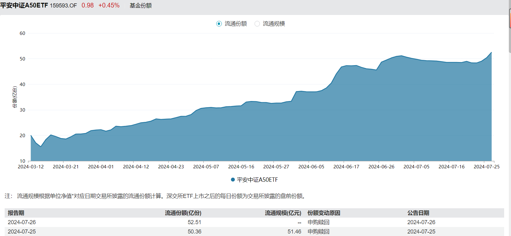 市场震荡调整下,资金借道ETF入场不断。Wind数据显示,上周(7月22日—26日),中证A50指数ETF(159593)累计获资金净流入超4.1亿元。而随着资金逆市布局,该ETF的基金份额和规模也不断增长。Wind数据显示,上周中证A50指数ETF(159593)的基金份额增长超4亿份,截至7月26日收盘,该ETF的最新份额为52.51亿份,基金规模为51.46亿元,再创历史新高,且居同标的产品第一。